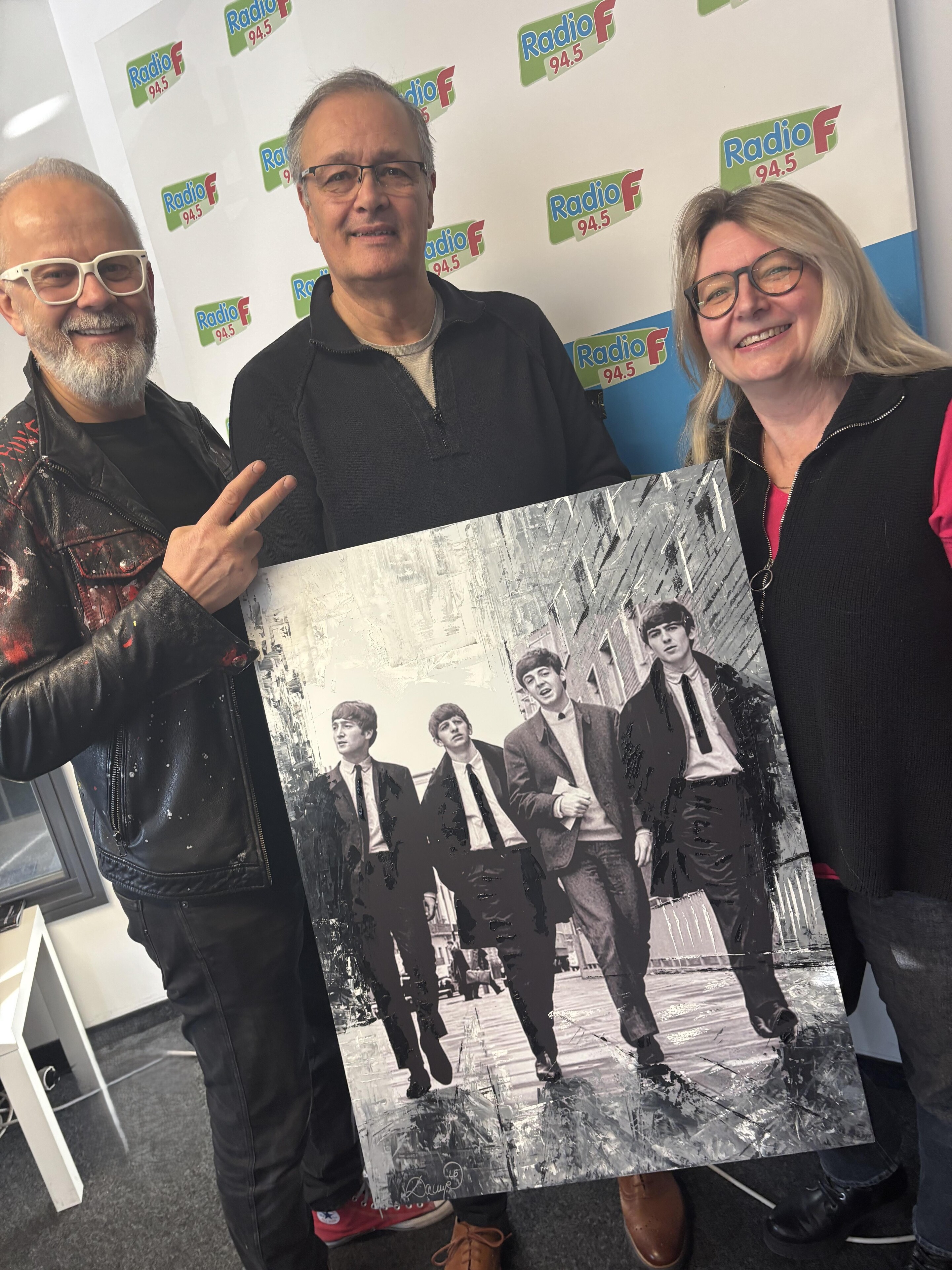 Dieses Mal gab es am Spendentag eine besondere Aktion: Der Künstler Damir Corell gestaltete live in der Radio F Redaktion ein Beatles-Bild, das dann ebenfalls zugunsten von Engelein e.V. versteigert wurde. Auch dieses Werk wurde im Rahmen der Scheckübergabe dem Meistbietenden überreicht.