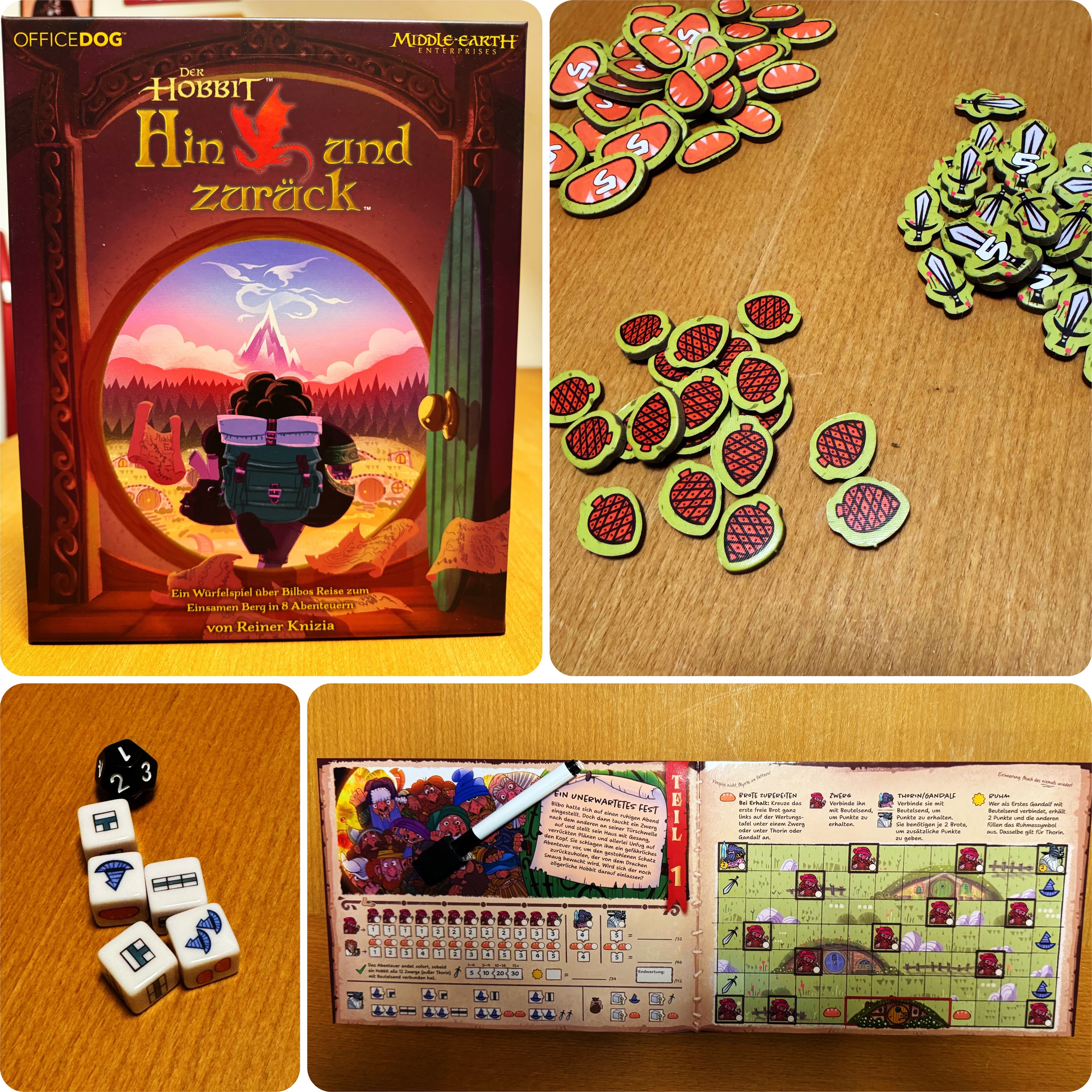Im Würfel- und Ankreuz-Spiel ("Roll & Write") “Der Hobbit: Hin und zurück” spielen wir den Kampf um den Drachen Smaug und den Zwergenschatz in acht Kapiteln nach. Die Kapitel sind in einem schönen pappdicken Abenteuerbuch. Wer dran ist, rollt fünf Würfel und entscheidet sich für einen. Entweder, um auf einer Karte Pfade einzuzeichnen oder um Ressourcen zu sammeln und Effekte auszulösen. Die bringen Punkte. Danach wählen die Mitspieler je einen Würfel aus. Wer das Ziel des Kapitels als erstes erreicht, beendet das Abenteuer und es wird abgerechnet. Spielt sich schön fluffig, kurzweilig und abwechslungsreich von Kapitel zu Kapitel. Sehr gut auch solo spielbar oder - wer es knackiger mag - im Expertenmodus.